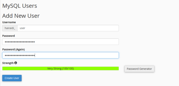 - Precisamos criar um usuário para o banco de dados criado. Clique em Voltar para retornar à página anterior e crie um novo usuário na seção Usuários do MySQL, inserindo o nome de usuário e a senha e clicando em Criar Usuário;